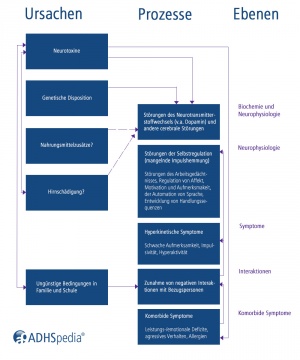 Noch immer (2026) sind die Entstehungsbedingungen und Ursachen der ADHS nicht vollständig geklärt. Die Ätiologie der ADHS ist seit vielen Jahren Gegenstand kontroverser Diskussionen, insbesondere, da sich das störungsspezifische pathophysiologische Gefüge der ADHS derzeit noch nicht ausreichend fundiert beschreiben lässt und da zahlreiche auch neurobiologische Befunde[2][3][4][5][6][7] ebenfalls bei anderen psychiatrischen Störungen zu erheben sind.[8] Gemeinhin anerkannt, jedoch nicht unumstritten, ist das sogenannte biopsychosoziale/multifaktorielle Entstehungsmodell[9], das besagt, dass das Störungsbild in mehr als der Hälfte der Fälle auf genetische und exogene Beteiligungsfaktoren zurückzuführen ist.[10] Ein vollständiges und zugleich stimmiges Entstehungsmodell zur ADHS existiert aktuell jedoch nicht.[11]