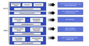 Anders als im DSM-IV, das die ADH-Störung anhand der ADHS-Leitsymptome gliedert, orientiert sich das ICD-10 am Vorhandensein einer Störung des Sozialverhaltens. Betroffene, die nur durch ihre Unaufmerksamkeit, nicht aber durch Überaktivität und Impulsivität auffallen, werden auf diese Weise im ICD-10 diagnostiziert.